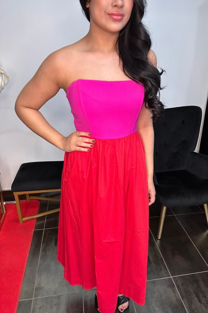 100% Polyester Magenta tube top with 100% Cotton Red Dress